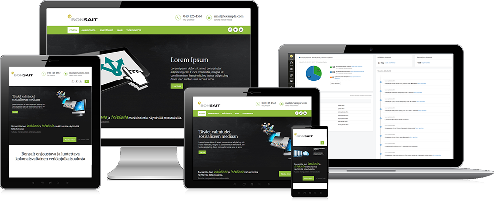 Bonsait on asiakkaalle joustava ja luotettava ratkaisu, joka toimii kokonaisvaltaisena työkaluna verkkojulkaisuun. Käytössäsi on monipuoliset ja tehokkaat työkalut, joilla ylläpidät helposti www-sivustoja sekä toteutat markkinointiviestintääsi.