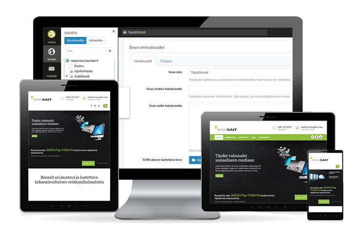 Luo uusia sivustoja joko Bonsait teemasta, kehitä oma teema tai kopioi sivusto jostakin tekemästäsi sivustosta. Hallinnoi domainnimiä sekä asiakastunnuksia yhdestä paikasta.
