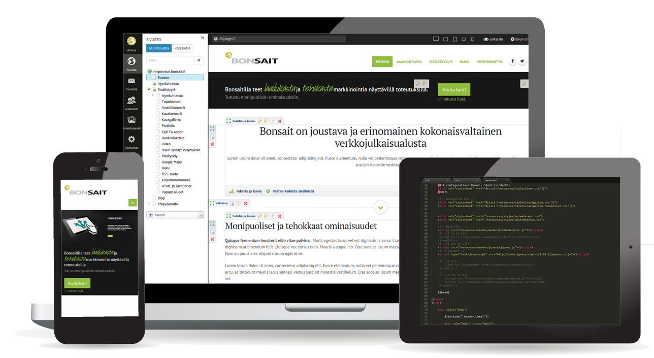Voit jatkaa tuttujen työkalujen käyttöä. Bonsait teeman luomiseen ja hallinnointiin voit käyttää normaalia tekstieditoria. Kaikki näkymät on muokattavissa käyttäen html ja css kieliä.