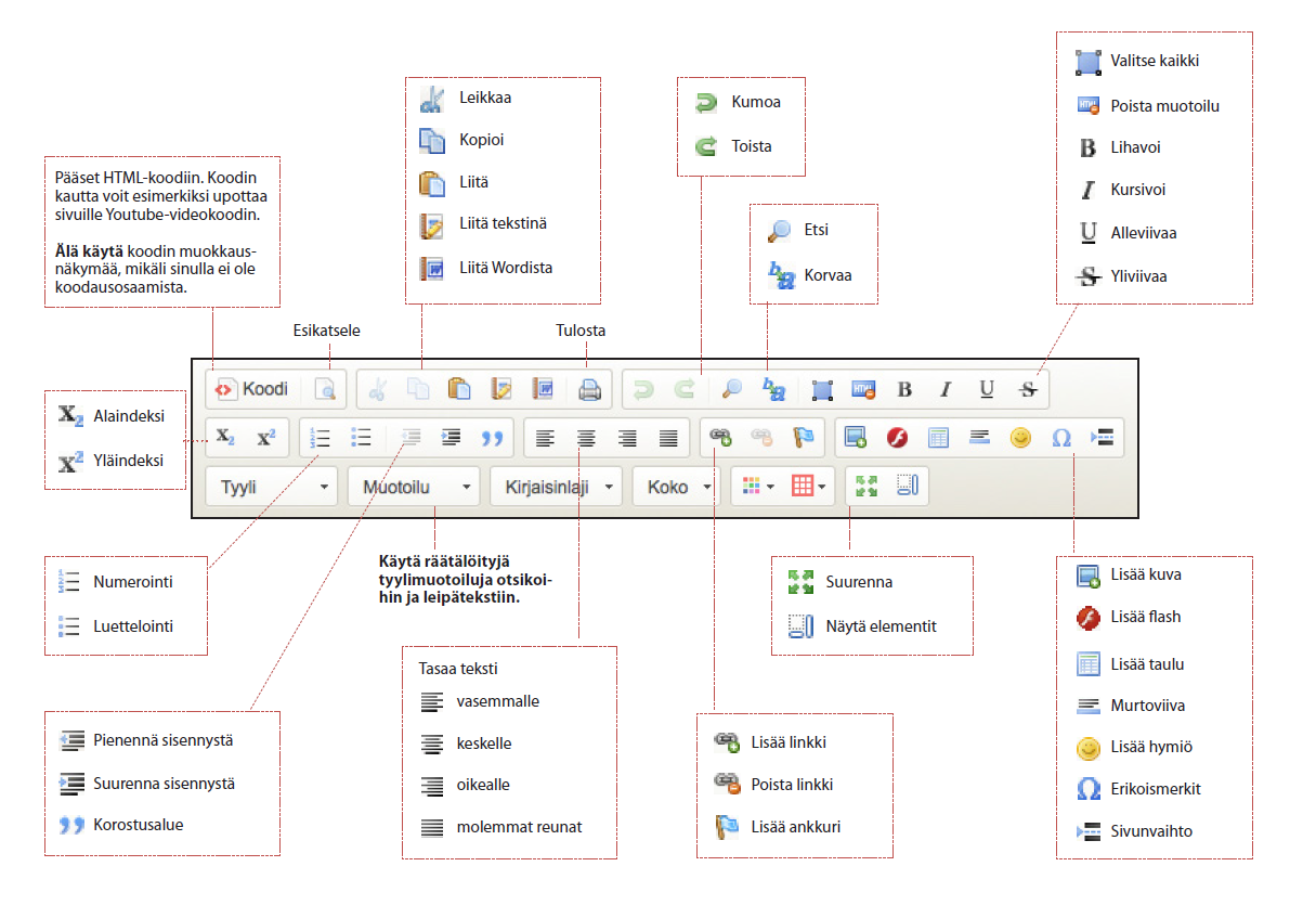 - Sisältöeditorissa voit muokata tekstiä samalla tavalla kun useimmissa tekstinkäsittelyohjelmissa. Rivinvaihdon voit tehdä painamalla Shift + Enter. Kappalevaihdon saat Enter-painikkeella. Käytä ennalta määriteltyjä tyylimuotoiluja. Voit poistaa sisältöä maalaamalla halutun sisällön ja painamalla Delete-nappia.